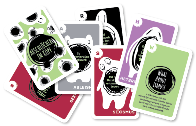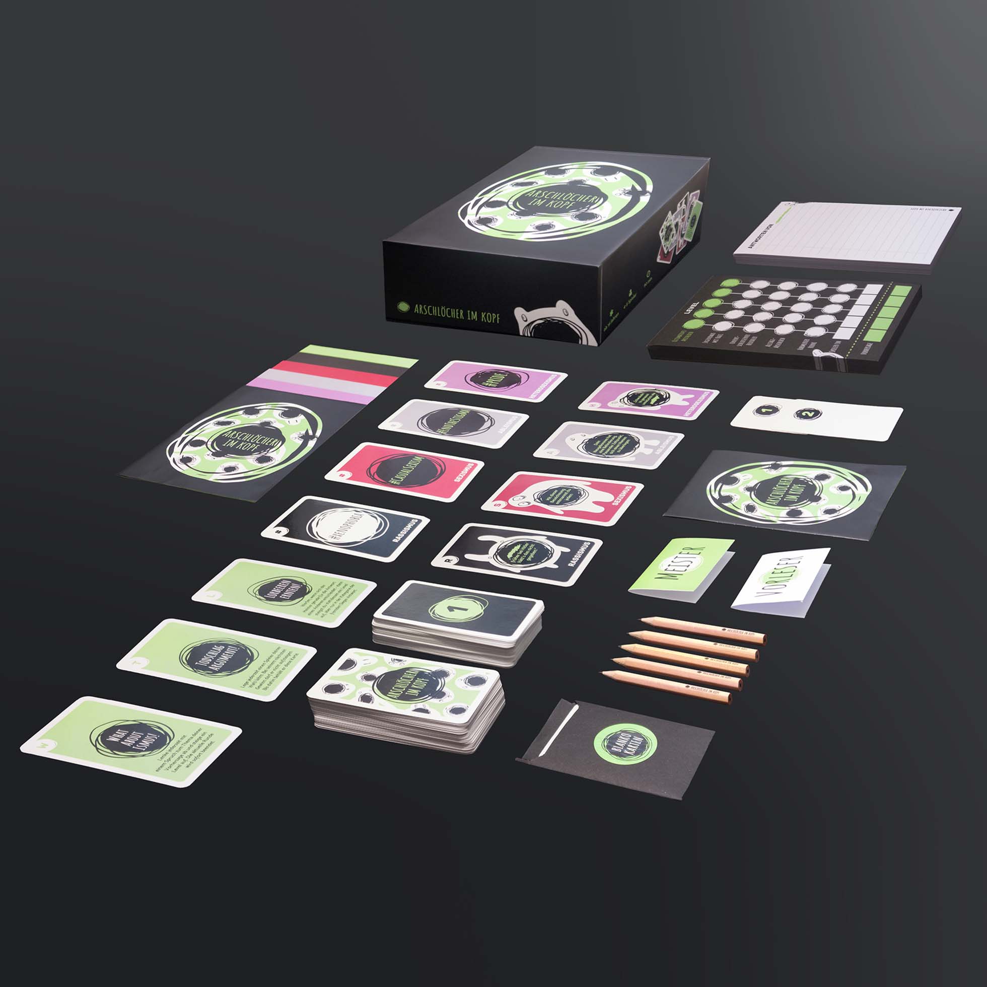 Optik: Kontrastreich, mit personifizierten, illustrierten Arschlöchern, die jeweils einen Spruch in sich tragen: so entsteht eine leichte Abwechslung und Auflockerung im Spielablauf.